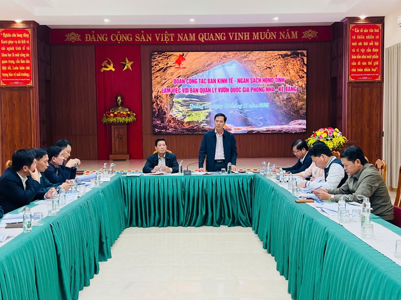 Chiều ngày 19/11/2025, Ban Kinh tế – Ngân sách Hội đồng nhân dân tỉnh Quảng Trị đã có buổi làm việc với Ban Quản lý Vườn Quốc gia Phong Nha – Kẻ Bàng để nắm thông tin, có cơ sở thẩm tra các nội dung theo phân công của Thường trực HĐND tỉnh trình tại kỳ họp thường lệ cuối năm 2025 của HĐND tỉnh. Tham dự và chủ trì buổi làm việc có đồng chí Nguyễn Đăng Ánh – Trưởng ban Kinh tế – Ngân sách HĐND tỉnh. Cùng dự có các đồng chí thành viên Ban Kinh tế – Ngân sách HĐND tỉnh.
