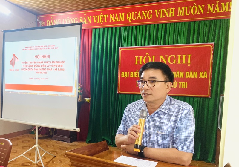 Thực hiện Kế hoạch số 93/KH-VQG ngày 24/7/2025 của Ban Quản lý VQG Phong Nha – Kẻ Bàng về tuyên truyền phổ biến pháp luật về Lâm nghiệp đối với cộng đồng năm 2025, từ tháng 9 đến tháng 10/2025, Trung tâm Bảo vệ rừng và Di sản thế giới thuộc Ban Quản lý Vườn Quốc gia (VQG) Phong Nha – Kẻ Bàng đã phối hợp với chính quyền địa phương, các cơ quan chức năng tổ chức thành được 10 hội nghị tuyên truyền pháp luật đến 14 thôn bản trên địa bàn gồm: Thôn Chày Lập, Thôn 5 Xuân Trạch, bản Rào Con và TDP Cù Lạc 2, xã Phong Nha; bản Đoòng, bản Nịu và bản Cồn Roàng, xã Thượng Trạch; bản Ploang và Rìn Rìn, xã Trường Sơn, thôn Phù Minh, bản Phú Nhiêu, bản Ón, Yên Hợp, Mò O Ồ Ồ của xã Kim Phú với sự tham gia và ký cam kết bảo vệ rừng của trên 540 người dân.