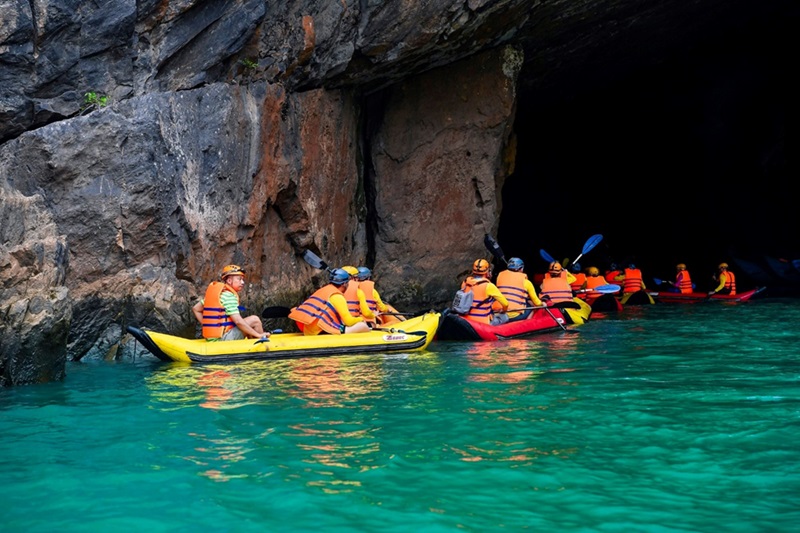 13h00 - 13h30: Chèo Kayak trở ra gần cửa hang động để tham quan Hang Tiên và Hang Cung Đình nơi có những khối thạch nhũ lung linh huyền ảo nhất của hang động như: Quả Chuông Vàng lớn nhất, Bức Bình Phong, Khuê phòng Nàng Tiên, Mái Tóc Nàng Tiên một tuyệt tác kì vĩ của tạo hóa, Long Sàng Nhà Vua, ruộng bậc thang ....