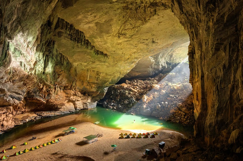 Một trong những điểm ấn tượng nhất của tour là cắm trại trên bãi cát phẳng mịn bên trong lòng hang, cạnh dòng sông ngầm và hồ nước màu ngọc bích đặc trưng. Từ tháng 12 đến tháng 3, những tia nắng mặt trời chiếu xuyên qua cửa hang tạo nên khoảnh khắc thiên nhiên kỳ ảo, được xem là “biểu tượng ánh sáng” của Hang Én.