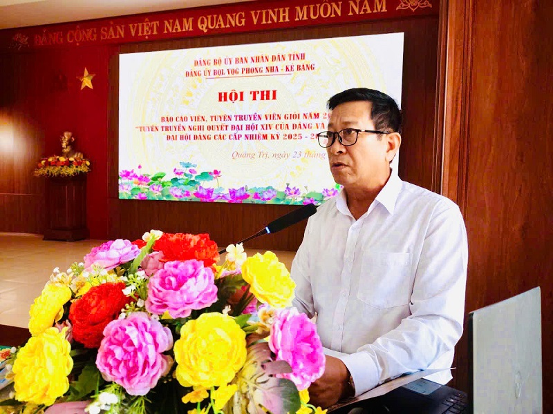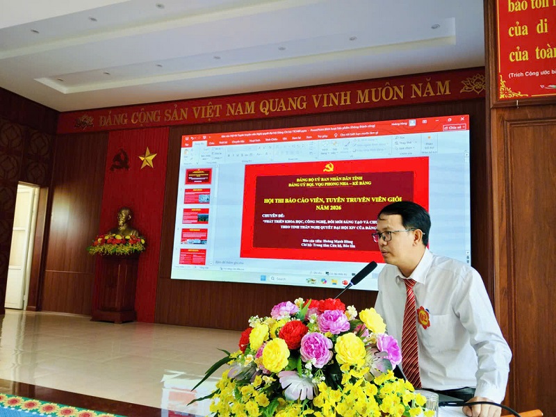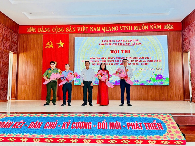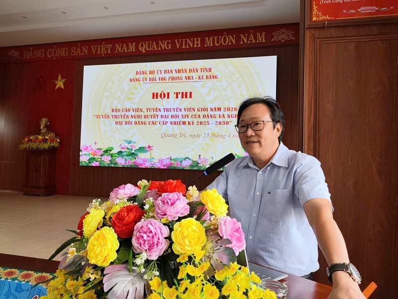 Thực hiện Kế hoạch số 36-KH/ĐU ngày 30/3/2026 của Đảng ủy UBND tỉnh và Kế hoạch số 40-KH/ĐU ngày 31/3/2026 của Đảng ủy Ban quản lý Vườn quốc gia Phong Nha – Kẻ Bàng  (Đảng ủy Ban quản lý Vườn), sáng ngày 23/4/2026, Đảng ủy Ban quản lý Vườn đã tổ chức Hội thi Báo cáo viên, Tuyên truyền viên giỏi năm 2026 “Tuyên truyền Nghị quyết Đại hội XIV của Đảng và nghị quyết đại hội đảng bộ các cấp nhiệm kỳ 2025 – 2030”.